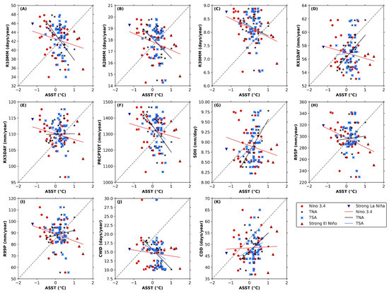 Relationship between sea surface temperature (SST) anomalies in the Pacific Ocean (Niño 3.4), Northern and Southern Atlantic Ocean sectors (TNA) (TSA), and extreme climate precipitation indices: number of heavy precipitation days (R10mm) (A); number of very heavy precipitation days (R20mm) (B); number of days above 30 mm (R30mm) (C); max 1-day precipitation amount (Rx1day) (D); max 5-day precipitation amount (Rx5day) (E); annual total wet day precipitation (PRCPTOT) (F); simple daily intensity index (SDII) (G); precipitation on very wet days (R95p) (H); precipitation on extremely wet days (R99p) (I); consecutive wet days (CWD) (J); and consecutive dry days (CDD) (K) over South America from 1979 to 2020.