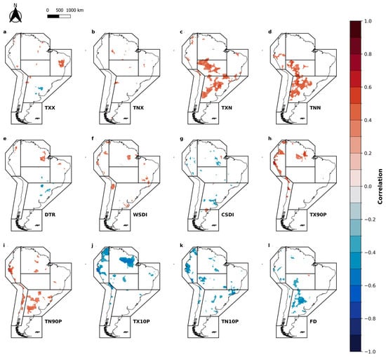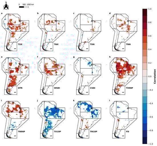 Pearson correlation coefficients between sea surface temperature (SST) anomalies in the Northern Atlantic Ocean (TNA) sector and extreme climatic temperature indices: warmest day (TXx) (a); warmest night (TNx) (b); coldest day (TXn) (c); coldest night (TNn) (d); diurnal temperature Range (DTR) (e); warm spell duration (WSDI) (f); cold spell duration (CSDI) (g); warm days (TX90p) (h); warm nights (TN90p) (i); cool days (TX10p) (j); cool nights (TN10p) (k); and frost days (FD) (l) over the climate reference regions of the Sixth Assessment Report of the Intergovernmental Panel on Climate Change (IPCC—AR6) on South America from 1979 to 2020. Only values with statistical significance at the 5% level are presented in the maps.