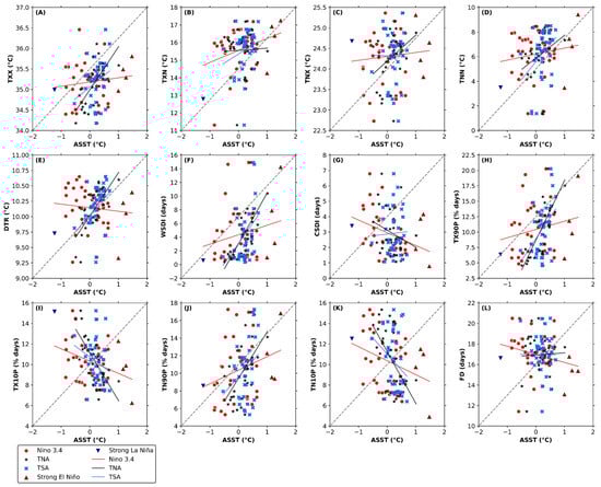 Relationship between sea surface temperature (SST) anomalies in the Pacific Ocean (Niño 3.4), Northern and Southern Atlantic Ocean sectors (TNA) (TSA), and extreme climate temperature indices: warmest day (TXx) (A); warmest night (TNx) (B); coldest day (TXn) (C); coldest night (TNn) (D); diurnal temperature Range (DTR) (E); warm spell duration (WSDI) (F); cold spell duration (CSDI) (G); warm days (TX90p) (H); warm nights (TN90p) (I); cool days (TX10p) (J); cool nights (TN10p) (K); and frost days (FD) (L) over South America from 1979 to 2020.