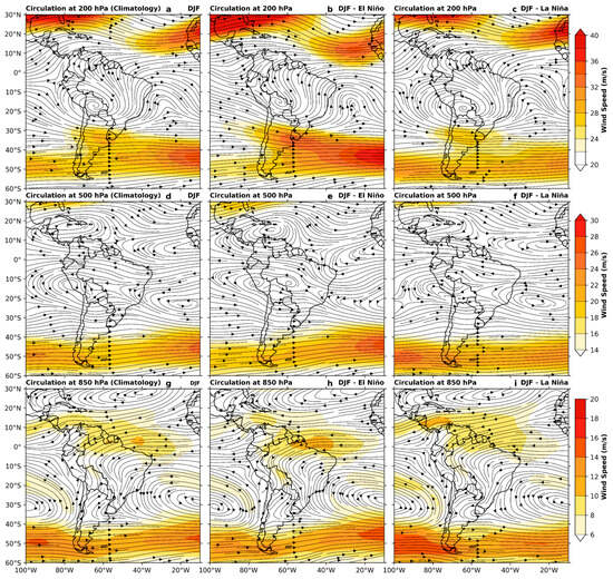 Atmospheric circulation climatology (a,d,g) and observed atmospheric circulation under El Niño (b,e,h) and La Niña (c,f,i) conditions at pressure levels of 200 hPa, 500 hPa, and 850 hPa, respectively, over South America. The shaded region represents wind speed in m s−1. The climatology period is from 1981 to 2010, while the observed data refers to the mean composites of the intense El Niño events in 1982–1983, 1997–1998, and 2015–2016, and La Niña in 1988–1989, 1999–2000, and 2010–2011 in the December–January–February (DJF) quarter.