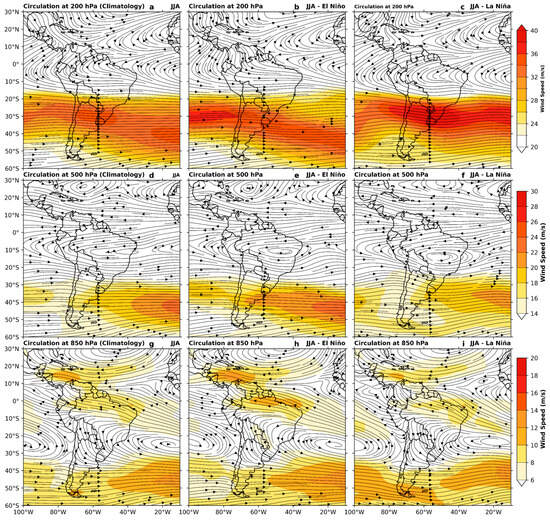 Atmospheric circulation climatology (a,d,g) and observed atmospheric circulation under El Niño (b,e,h) and La Niña (c,f,i) conditions at pressure levels of 200 hPa, 500 hPa, and 850 hPa, respectively, over South America. The shaded region represents wind speed in m s−1. The climatology period is from 1981 to 2010, while the observed data refers to the mean composites of the intense El Niño events in 1982–1983, 1997–1998, and 2015–2016 and La Niña in 1988–1989, 1999–2000, and 2010–2011 in the June–July–August (JJA) quarter.