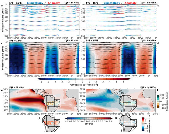 Climatology (blue vectors) and anomaly (red vectors) of vertical wind velocity between 5 °S and 15°S during El Niño (a) and La Niña (b) events in the December-January-February (DJF) quarter. (c,d) Vertical wind speed (filled contours) and wind direction (arrows) between 5 °S and 15 °S during El Niño (c) and La Niña (d) events in the DJF quarter. (e,f) Sea surface temperature (SST) anomalies and precipitation anomalies over the continent between 5 °S and 15 °S during El Niño (e) and La Niña (f) events in the DJF quarter. (g,h) Air temperature anomalies over the continent between 5 °S and 15 °S during El Niño (g) and La Niña (h) events in the DJF quarter. Data correspond to the composite averages of El Niño (1982–1983, 1997–1998, and 2015–2016) and La Niña (1988–1989, 1999–2000, and 2010–2011) events in the DJF quarter.