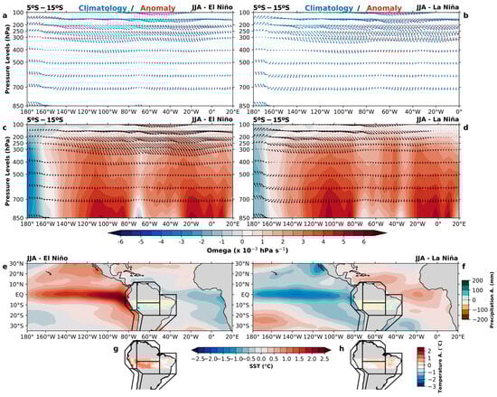 Climatology (blue vectors) and anomaly (red vectors) of vertical wind velocity between 5 °S and 15 °S during El Niño (a) and La Niña (b) events in the June-July-August (JJA) quarter. (c,d) Vertical wind speed (filled contours) and wind direction (vectors) between 5 °S and 15 °S during El Niño (c) and La Niña (d) events in the JJA quarter. (e,f) Sea surface temperature (SST) anomalies and precipitation anomalies over the continent between 5 °S and 15 °S during El Niño (e) and La Niña (f) events in the JJA quarter. (g,h) Air temperature anomalies over the continent between 5 °S and 15 °S during El Niño (g) and La Niña (h) events in the JJA quarter. Data correspond to the composite averages of El Niño (1982–1983, 1997–1998, and 2015–2016) and La Niña (1988–1989, 1999–2000, and 2010–2011) events in the JJA quarter.