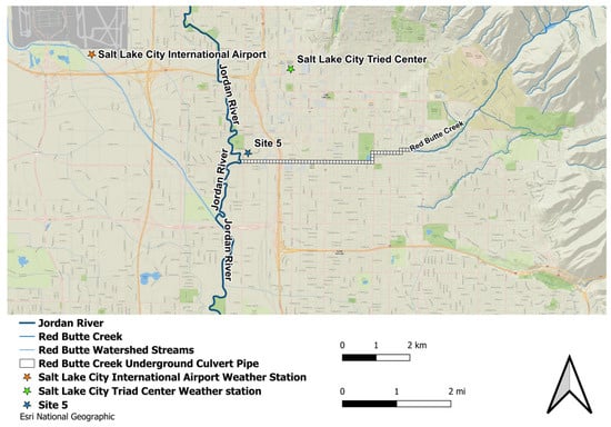 Figure 1 shows parts of Salt Lake City and Salt Lake County in UT, USA. The assumed ASR well location is within a 15.271-acre residential city block (Site 5). The site is located to the northeast of the confluence of the westward-flowing Red Butte Creek and the northward-flowing Jordan River. It is (a) bounded on the north and south by Fremont and Lucy Avenues, respectively; (b) almost bisected from north to south by Jeremy Street; and (c) bounded to the west and east by South 900 W and South 800 W, respectively.