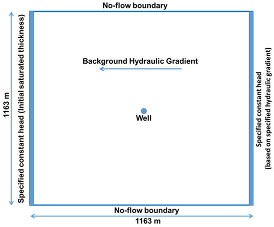 After the selection of approximately half-month durations for the flow and solute transport simulations, standard methods were used in estimating the advective plume length after two months (61 days) of injection; the longitudinal dispersivity; courant number; maximum time step size; total number of simulation time steps; and time steps per stress period. These estimates enabled preparing a groundwater aquifer model domain that was sufficiently large and assumed injection and extraction rates would not appreciably affect any of the employed boundary conditions. Inputting the hydrogeologic parameters for the selected site preceded the execution of the simulations. This study assumes that the aquifer is both isotropic and homogeneous, which might be an oversimplification given that real-world conditions often exhibit significant heterogeneity and anisotropy that can impact flow and solute transport. A single-site location might limit the generalizability of the findings to other geographical or hydrogeological contexts.