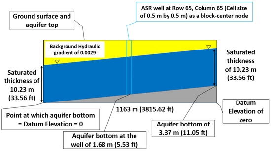 This section explains assumptions, parameters, and procedures relating to obtaining REN values of ASR via flow [32] and solute transport [33] simulations. Here, the goal is to improve available groundwater during the dry period (June–August) by injecting excess surface water (i.e., harvested rainwater) into an unconfined aquifer during a preceding wet period (April–May) in a city block. Based upon work by Fetter [34], Bedient et al. [35], Pavelic et al. [23], Ward et al. [25,26], Bakker [21], Brown et al. [28], Smith et al. [14], Forghani and Peralta [18], and Masoudiashtiani and Peralta [19], in the following section, we use values of the hydrogeologic factors that impact the REN (i.e., injectate recovery) of ASR.