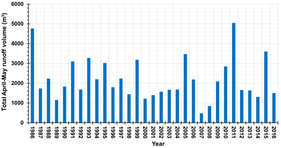 Here, for the selected site (Site 5), water-volume use of stormwater runoff (i.e., harvested rainwater) during the wet months (April and May) could provide ASR injection water. To quantify the volume, the April–May runoff volume of every year from 1986 to 2016 (31 years) at Site 5 was simulated using WinSLAMM 10.4.1 software. Figure 4 shows the annual volumes that were used for ASR injection from April to May of each year.