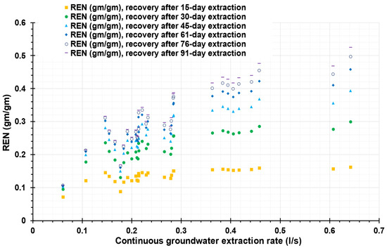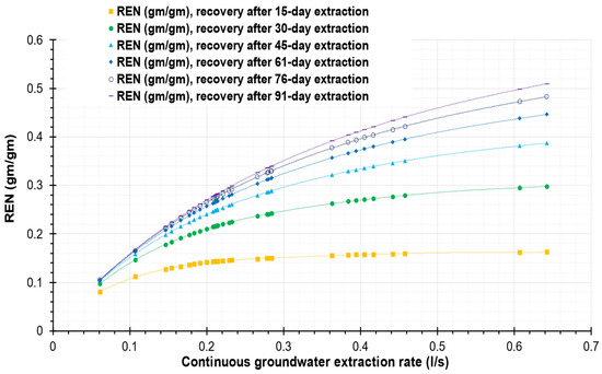 When comparing the REN values resulting from the steady versus unsteady injection of the same total volume, it becomes clear that unsteady injection could achieve a higher or lower predicted REN than the steady one. For example, the simulated injection volumes for 1987 and 2001 (e.g., Figure A3 shows simulated flow rates of 61-day unsteady and steady injections and 91-day steady extraction for 2001) are 1392.81 m3 and 1738.17 m3, respectively. For 1987, the predicted REN values of the steady and unsteady injections are 0.288 (gm/gm) and 0.342 (gm/gm), respectively. For 2001, the respective REN values are 0.248 (gm/gm) for steady injection and 0.168 (gm/gm) for unsteady injection.