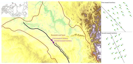 Serious problems in assessing meteorological factors on radon migration in the near-surface soil layer affect the correctness of assessing the radon hazard of faults, their detection and mapping, and assessing their current activity [41,42,43]. In most studies on radon fields, measurements are made at depths of 0.5–1.0 m. At such a measurement depth, there is a high probability of errors due to the strong influence of weather conditions on the RAC in soil gas. At the same time, to detect the fault and its boundaries, a large volume of observations are required, and the role of daily differences in this case increases. The aim of our study is to investigate the features of the vertical gradation of RAC in soil gases in the area of an ancient fault. This will allow us to supplement the information on the permeability of fault areas for radon, since it is assumed that the increased crack–pore space of the fault area is capable of stimulating air exchange between the soil gas and the surface layer of the atmosphere. The relevance of studying RAC in soil gases is associated with the correlation of these data with the radon hazard of residential buildings [44,45,46,47]. These studies are especially important for areas of seismic activity, since the intensity of radon gas emission is greatest in such areas [40]. These territories include the Kuznetsk coal basin and the tectonic structures surrounding it.