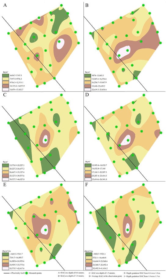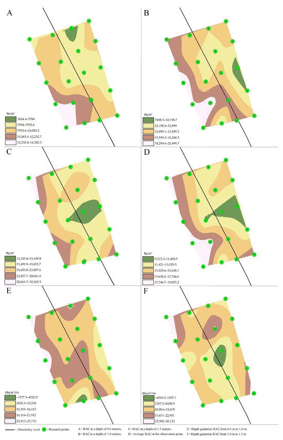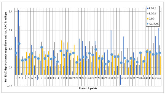 Depth gradients were calculated as the change in RAC ratio between depths of 1.5/1.0 m, 1.0/0.6 m, 1.5/0.6 m and 0.6/0 m, respectively. The gradient shows the change in RAC per 1 m of depth. All values of gradients and average RAC between three depths (1.5 m, 1.0 m, and 0.6 m) were standardized relative to the average value for all observation points. RAC at depth 0 was taken as 0 Bq/m3, since this is the most probable value based on the fact that rapid dilution of soil gas occurs in the surface layer [51].