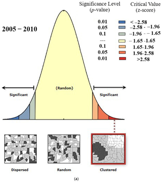 The magnitude of the Z-score reflects the intensity of the clustering. A higher positive Z-score means a more pronounced hotspot, while a more negative Z-score indicates a stronger cold spot [37]. The formulas used for these methods are as follows: