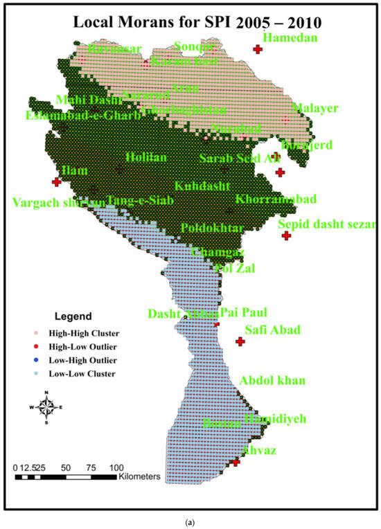 The clusters of local Moran’s I maps extracted from ArcGIS software are presented in Figure 5 and Figure S2. The results of examining Figure 5a and Figure S2a show that the drought clustering pattern in the Karkheh watershed from 1981 to 2016 consisted of two types, namely high–high and low–low. Based on Figure 5a and Figure S2a, in the early years of the period, severe drought was observed in the northern parts of the basin, and in the later years, severe drought was observed in the south and mild drought in the north. In the early years of the statistical period, from 1981 to 1986, the drought in the region consisted of two parts, with severe drought in the northeast, parts of the west, and a small part of the south and mild drought in the southwest, center, and a small part of the northwest. Also, parts of the central and northern parts of the Karkheh watershed did not follow a specific pattern. According to Figure 5a and Figure S2a, in the last years of the period, mild drought was observed in the north of the basin and severe drought in the south. From 2005 to 2010, the drought in the region consisted of two parts, with severe drought in the south of the region and mild drought in the north and east of the region. Also, a large part of the center of the study area did not follow a specific pattern. From 2011 to 2016, severe drought occurred in the southern part and mild drought in parts of the east and west of the region. The local Moran’s I maps based on the SPEI are shown in Figure 5b and Figure S2b. Based on the results, the drought clustering pattern in these areas also consists of two types, namely high–high and low–low. In the early years, the north of the region experienced severe drought, and in recent years, a severe drought has impacted the southern portion of the basin. Also, at the beginning of the statistical period, from 1981 to 1986, the drought in the region consisted of two parts, with severe drought in the north and west of the region and mild drought in parts of the south and center of the region. Also, in the final years of the statistical period, based on Figure 5b and Figure S2b, from 2005 to 2010, the drought in the region consisted of two parts, with severe drought in the south and west of the region and mild drought in the north of the region. From 2011 to 2016, severe drought was also observed in the south of the region and mild drought in the center of the basin.