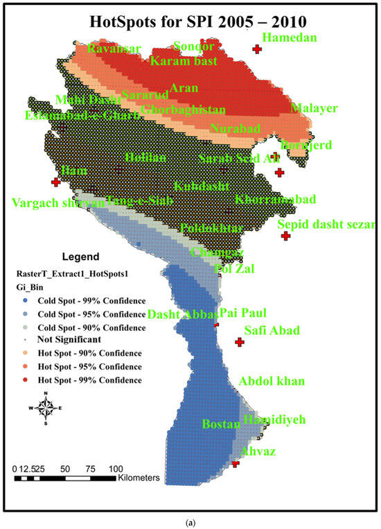 In summary, the spatial statistics analysis in this study follows these steps. First, using global Moran’s I, it is determined whether the calculated droughts at the stations in the Karkheh watershed exhibit a dispersed or clustered pattern. Second, local Moran’s I is used to identify clusters with severe and mild droughts. However, at this stage, these clusters are not classified; they only indicate that severe or mild droughts have occurred in these areas, without considering the severity level (for example, all areas with a drought index below −1.5 are shown as areas with severe drought). In the third step, the Gi* statistic is used to calculate the significance level of drought severity in different clusters. The higher the significance level, the more severe the drought or wet spell in that cluster. Therefore, the clusters are again more precisely classified based on the drought index value.