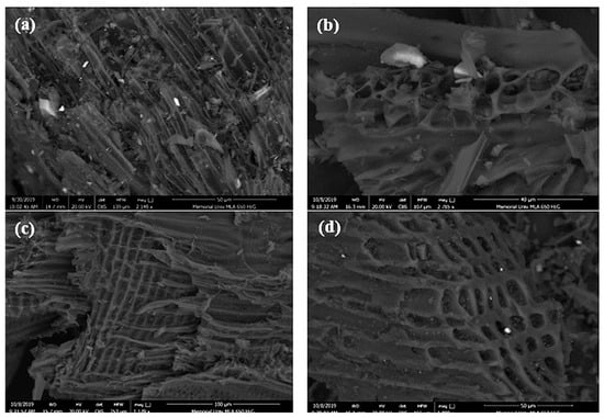 SEM images of the biochars, including (a) SB550, (b) HW500, (c) FS427, and (d) SW500.
