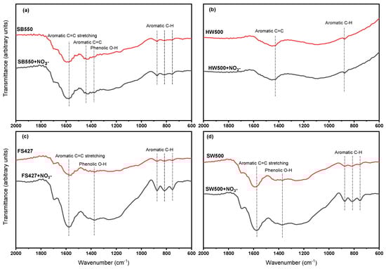 FT-IR spectra of biochars before and after nitrate adsorption highlight key functional groups, such as aromatic C=C stretching and phenolic O–H bending, which contribute to nitrate adsorption efficiency. The spectra include the following biochars: (a) SB550, (b) HW500, (c) FS427, and (d) SW500.
