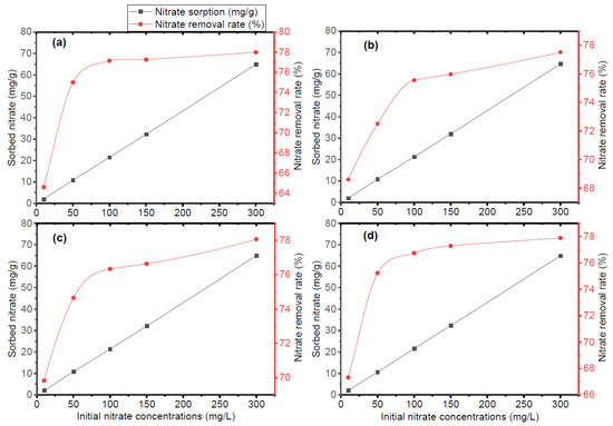 Effect of initial nitrate concentration on nitrate adsorption (mg/g) and nitrate removal rate (%) by biochar (a) SB550, (b) HW500, (c) FS427, and (d) SW500.