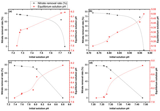Effect of initial solution pH and the equilibrium solution pH on nitrate removal rate, (a) SB550, (b) HW500, (c) FS427, and (d) SW500.