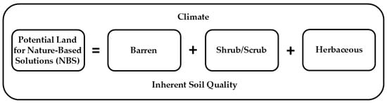 Potential land for nature-based solutions (NBS) can be defined as the sum of the individual areas of barren, shrub/scrub, and herbaceous land covers, which are linked to climate and inherent soil quality (SQ) (adapted from Mikhailova et al. 2024 [15]).