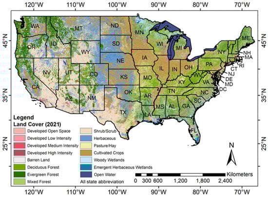 Land cover map of the contiguous United States of America (USA) for 2021 (based on data from the Multi-Resolution Land Characteristics Consortium (MRLC) [18]). Land cover types show large areas of anthropogenic land degradation (e.g., hay/pasture, cultivated crops, developed, and barren land). Inherent land degradation is difficult to identify through remote sensing techniques because it is largely based on soil and climate.