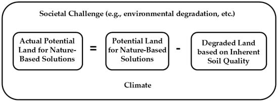 Actual potential land for nature-based solutions (NBS), as newly proposed, is the difference between the total potential land for NBS (barren, shrub/scrub, and herbaceous land covers) and inherently degraded land (inherently degraded land: soil suitability based on soil types), which is directly linked to inherent soil quality (SQ) and impacted by climate and climate change (adapted from Mikhailova et al. 2024 [15]). Barren lands are both potential areas for NBS and anthropogenically or inherently degraded lands.
