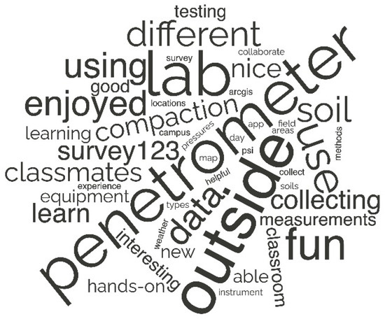 A word cloud was developed using the answers to the open-ended question to describe their favorite experiences as part of the exercise. The most frequently used words in the word cloud, such as “penetrometer,” “lab,” “outside,” and “fun,” which indicates that the learning objectives related to soil compaction, soil resistance, and penetrometer were met (Figure 4). Several words also noted the hands-on experience using cellphone applications was an essential part of the exercise (e.g., “hands-on,” “Survey123”). Somewhat less frequent occurrences of words linked to data collection, including “data” and “Survey123”, shows that even though the technological tools were listed, they were not as important of a topic for students when compared to the more popular soil compaction, penetrometer, and fieldwork terms listed.