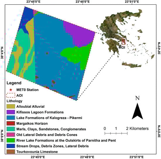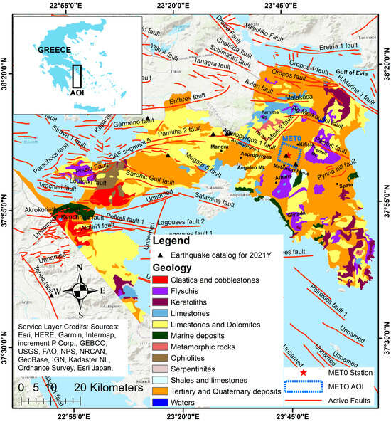 Map of the AOI and geology of Attica and the Corinth Canal. The area investigated, MET0, is highlighted on the map. The active faults highlighted on this map are from the National Observatory of Athens (NOA) database [49].
