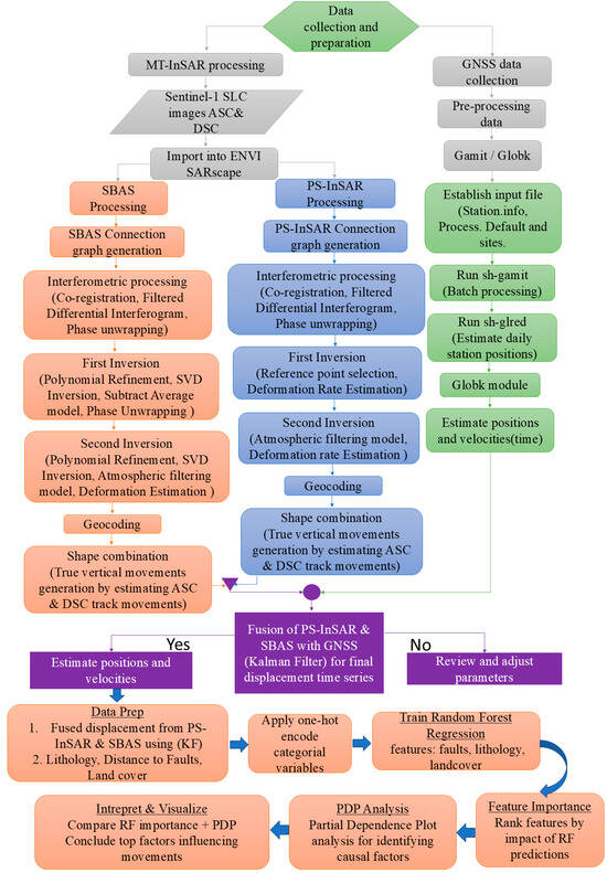 Processing flowchart of land subsidence monitoring and multi-sensor fusion using MT-InSAR and GNSS. Random Forest regression is used to identify the causal factors of ground movement.