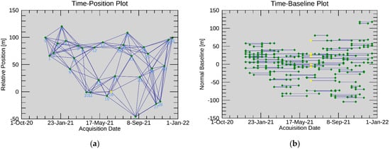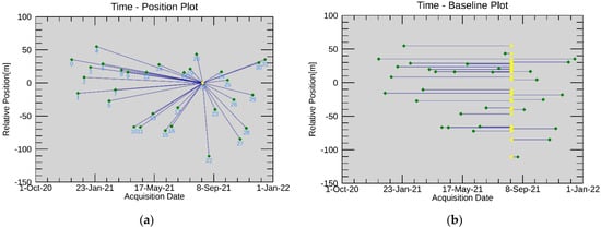 (a) Time–position of Sentinel-1 image interferometric pairs of PS-InSAR analysis and (b) time–baseline of Sentinel-1 image interferometric pairs (yellow diamonds denote the reference image, blue lines represent interferometric pairs, and green diamonds represent the secondary images).