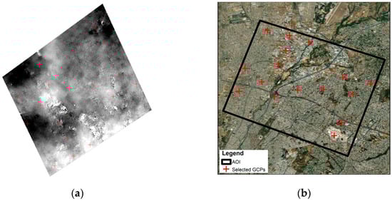To optimize interferograms and ensure robust displacement estimates, manual refinement was conducted using Ground Control Points (GCPs). The coherence maps served as reference layers underlying the unwrapped interferograms to select stable GCP locations systematically. In total, more than 16 stable points (GCPs) (Figure 6), predominantly located on coherent urban features, such as buildings and roads, were manually identified across the AOI.