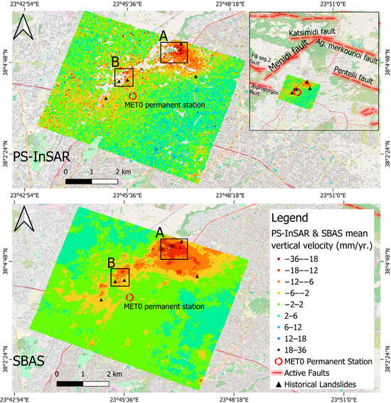 An MT-InSAR technique was applied to a 6 × 6 km area in the Metamorphosis municipality (northern Attica), where the permanent MET0 station is located. The selected area is surrounded by active faults, such as Aspropyrgos-1, Menidi, and Penteli. Recent research conducted in 2021 on landslide susceptibility mapping for the Attica region via the rock engineering system method [43] identified landslide events in the MET0 study area. These events are caused by slope collapse due to river erosion and the instability of adjacent slopes due to the corrosive action of streams. The PS-InSAR analysis derived 247,978 scattered points with velocities ranging from −33.42 to +25.29 mm/yr, and the SBAS analysis derived 211,020 points with velocities ranging from −27.79 to +6.73 mm/yr. The differences in maximum velocities between the PS-InSAR and SBAS results are expected and can be attributed to the intrinsic characteristics of the two methodologies. PS-InSAR focuses on detecting highly coherent, isolated scatterers (such as buildings, rocks, and infrastructure), enabling it to capture localized extreme displacement rates with high precision. In contrast, SBAS relies on a network of Distributed Scatterers (DSs), which tend to represent spatially averaged deformation over larger areas, particularly in non-urban or vegetated regions. Consequently, SBAS results generally smooth out localized high-velocity events that PS-InSAR can detect, leading to slightly lower maximum and minimum velocity values. Therefore, the observed differences between the PS-InSAR and SBAS maximum velocities are consistent with the complementary nature of the two techniques. To assess ground movements in the MET0 study area, we selected two subareas, A and B (Figure 7). To accurately characterize temporal displacement patterns at the permanent MET0 station, displacement data obtained from GNSS, PS-InSAR, and SBAS techniques were integrated using a Kalman filtering Python-based fusion approach. This integration utilizes the complementary strengths of each method: GNSS provides precise temporal displacement measurement at discrete locations, while PS-InSAR and SBAS ensure extensive spatial coverage, capturing both linear and non-linear displacement signals across the AOI. By fusing these datasets, the approach mitigates the inherent noise and data gaps in individual measurements, particularly gaps or signal fluctuations common in GNSS time series, by yielding a refined and accurate estimation of ground displacement. Consequently, this fusion approach offers a wide representation of ground displacement, enhancing both spatial coverage and measurement reliability compared to single-method analyses Figure 7.