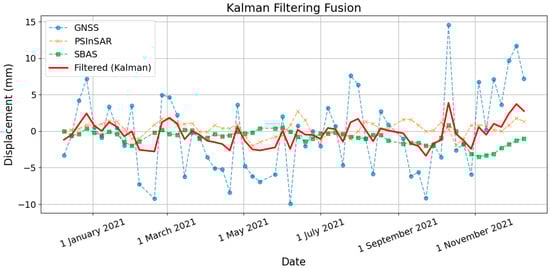 This framework allows the filter to weight each sensor’s measurement according to its noise level. A grid search over a range of potential noise parameters was performed to determine the optimal Kalman filter settings. The candidate values tested for each sensor’s measurement noise covariance (, , ) included {1.0, 0.5, 0.1}, and the process noise covariance Q was similarly varied within {1.0, 0.5, 0.1}. The error metric was defined as the sum of squared differences between the fused displacement time series and the average displacement from the individual GNSS, PS-InSAR, and SBAS measurements. The settings that minimized this error metric were selected as optimal. The final chosen parameters were and , resulting in a fused displacement series that exhibited smoother behavior and closely tracked the underlying deformation trend while effectively mitigating high-frequency noise. Cross-validation or independent datasets were not used due to the limited availability of ground truth data; instead, the internal consistency and physical plausibility of the fused time series were verified to ensure reliability.