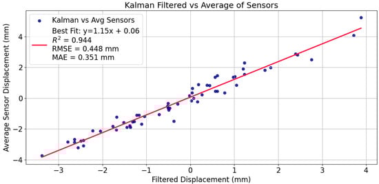 To quantitatively assess the accuracy and effectiveness of the Kalman filtering fusion approach, a comparison was performed between the fused displacement series and the average of three input sensors (PS-InSAR, SBAS, and GNSS time series). A linear regression analysis revealed a strong linear relationship between the Kalman-filtered series and the average sensor displacement, as shown in Figure 9. The high coefficient of determination (R2 = 0.94) confirms a strong agreement between the fused time series and the multi-sensor trend. Furthermore, the Root Mean Squared Error (RMSE = 0.4 mm) and Mean Absolute Error (MAE = 0.4 mm) indicate low residuals between the fused and reference series, supporting the capability of the method to mitigate short-term noise and inconsistencies present in individual measurements.