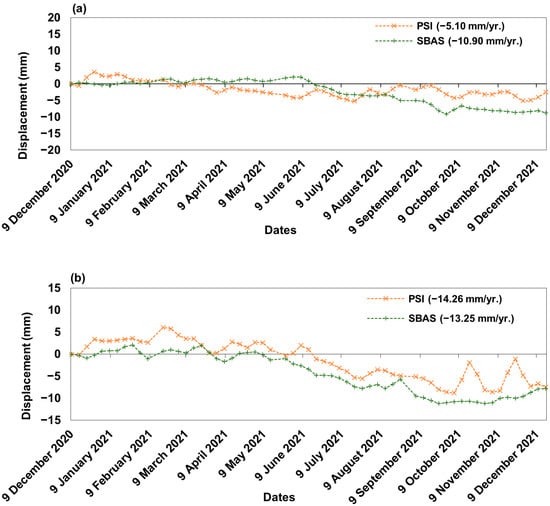 Comparison of the displacement time series of PS-InSAR and SBAS techniques for selected coinciding scatterer points in Areas A and B, as shown in Figure 7. (a) Time series for the scatterer point in Area A. (b) Time series for the scatterer point in Area B.