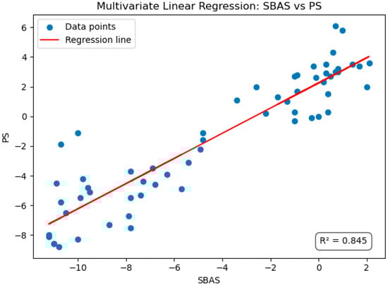 To quantitatively assess the relationship between PS-InSAR and SBAS displacement measurements at coinciding points in Area B, a multivariate linear regression analysis was performed. The resulting scatter plot (Figure 11) demonstrates a strong positive correlation (R2 = 0.845) between the two techniques, indicating a high degree of agreement in the detected displacement trends. The regression line closely follows the data distribution, confirming that, despite some variations in short-term fluctuations, PS-InSAR and SBAS consistently capture the same overall deformation patterns in this area.