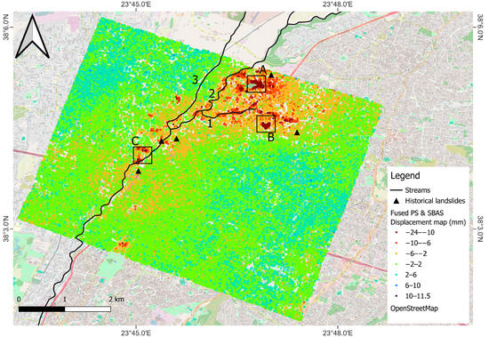 Kalman-filtered fused maximum displacement map by fusing PS-InSAR and SBAS vertical displacement data. Areas A, B, and C indicate zones of high subsidence exceeding −10 mm. Historical landslides are highlighted with black triangles. Stream segments 1, 2, and 3 are highlighted with black polylines; notably, streams 1 and 2 exhibit clear patterns of high subsidence along their path, whereas stream 3 shows uplift in its vicinity.