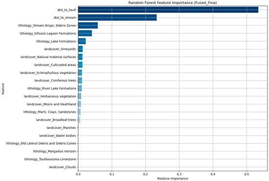 Random Forest regression was used to identify and quantify the most critical environmental and geological factors influencing subsidence in the study area. The key predictors considered in the analysis included distance to faults, distance to streams, lithology, and land cover. To achieve this, values for these predictors were extracted at the Kalman-filtered fused displacement points, ensuring that the analysis was based on refined displacement measurements. The distance-based predictors were calculated using Euclidean distance, which determines the shortest distance from each pixel to the nearest mapped fault or stream. All raster predictors were resampled and aligned to a common spatial resolution and projected to the WGS 84 _UTM Zone 34N coordinate system (EPSG:32634), which is suitable for the Attica region. This ensured consistency in spatial referencing and accuracy during distance-based sampling. Categorical variables, such as lithology and land cover, were processed using one-hot encoding to ensure compatibility with the machine learning model. This transformation allowed the model to accurately incorporate geological units and land cover types without imposing random numerical values that could misrepresent their influence. The Random Forest regressor was then trained using displacement values as the target variable, and feature importance scores were derived based on each factor’s contribution to reducing model prediction error.