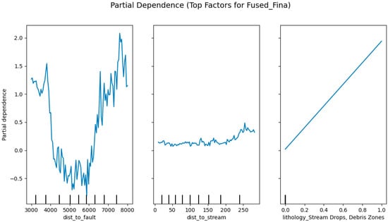 The fused displacement map highlights three primary zones (A, B, and C) experiencing significant subsidence (>10 mm/year), predominantly in regions of active urbanization and hydrological influence. The spatial correlation between high-subsidence zones and historical landslides reinforces the notion that past slope failures may serve as indicators of ongoing instability, necessitating continuous geohazard monitoring. Feature importance analysis using Random Forest regression identified distance to faults, proximity to streams, and lithology (stream drops and debris zones) as the dominant factors influencing subsidence trends. The Partial Dependence analysis confirmed that displacement exhibits a non-linear response to fault proximity, suggesting localized stress accumulation and threshold-dependent strain release, rather than uniform subsidence across fault zones. These findings underscore the necessity of monitoring fault-proximal regions, where persistent subsidence could compromise infrastructure stability over time.