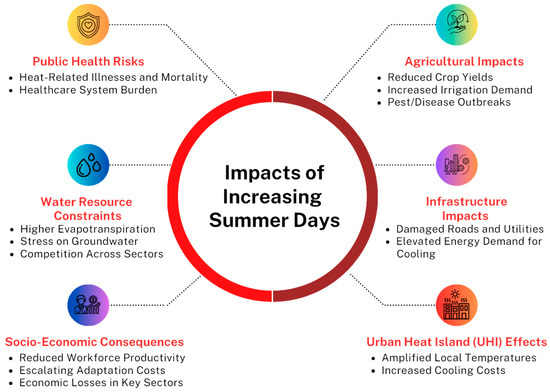 With global temperatures on the rise, the frequency and duration of summer days are expected to increase, amplifying vulnerabilities across India’s critical sectors. Figure 1 shows the multidimensional impacts of rising summer days on public health, agriculture, infrastructure, water resources, and urban environments. These impacts include increased heat-related illnesses and mortality, decreased crop productivity, elevated irrigation demands, and intensification of the urban heat island (UHI) effect. The projected escalation in summer days poses a direct threat to climate-sensitive populations, ecosystems, and economic stability, necessitating urgent region-specific adaptation strategies.