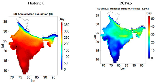 Spatial distribution of annual mean summer days (SU) during the historical period (1981–2005) and its future projections under different IWTs under RCP8.5 is shown in Figure 3. Annual mean SU is increasing relative to the historical period, and it will continue to increase due to the occurrence of high warming targets in the 21st century. Figure 3 represents the mean spatial variation in annual SU due to 1.5–4.5 °C IWT under the RCP8.5 scenario. The MME mean simulates 260.11 days, which spatially varied between 0 and 365 days in India. Western Himalaya and some parts of North-East India do not have any summer days in a year during this period. It was minimum in foothills of Himalaya and increased gradually towards southern regions of India (East Coast, West Coast, and Peninsular India). In East-Coast and West Coast India, the daily maximum temperature is higher than 25 °C throughout the year.