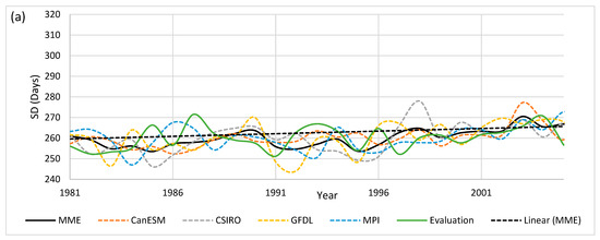 Time series of annual mean summer days (per grid; total grids 1297) during (a) historical period (1981–2005), (b) RCP4.5 (2006–2099), and (c) RCP8.5 (2006–2099) projected by evaluation, MME, and four CORDEX-SA experiments.
