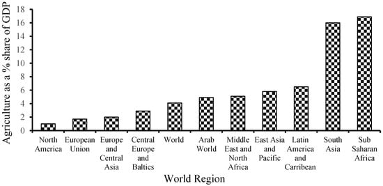 Agriculture as a share of total GDP in 2023 for world regions demonstrating the importance of agriculture in sub-Saharan Africa compared to other regions of the world. (Source World Bank Catalogue, 2025 [17]).