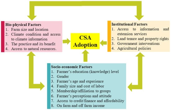 Although past studies suggest that farmer adoption of new practice is based on profitability [102], many other factors drive adoption decisions depending on practice availability, accessibility, and affordability [103]. Thus, farmers by nature employ a mix of adaptation strategies that can be complex and influenced by multiple factors, some simultaneously [98]. They can either adopt a single or multiple practices or not adopt at all based on several factors and ability [104]. Therefore, understanding how these components influence farmers’ decisions in selecting a specific CSA practice is necessary to aid the formulation of effective interventions and policies that promote their successful adoption. This paper, therefore, reviews the socio-economic, institutional, and biophysical factors that influence smallholder farmers’ adoption of CSA practices in sub-Saharan Africa. This determination is crucial to allow the development of well-informed and feasible strategies that facilitate successful CSA adoption by smallholder farmers.