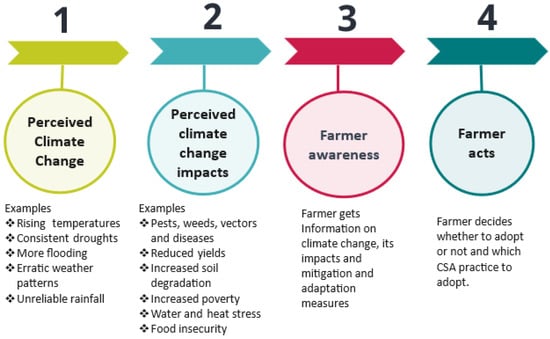 The perception farmers have on climate change as a threat and the severity of its impacts on their farming activities is a voluntary motivator for CSA adoption [122], if they have the right information. Studies in South Africa [56], Kenya [112], and Ethiopia [97] found that farmers with positive perceptions and attitudes to climate change are more likely to adopt CSA practices. They are influenced by their subjective assessment and perception of the factors that cause climate change [123]. On the other hand, a study in Tanzania found a higher tolerance to risk hindered adoption of CSA practices [124]. Thus, risk averse farmers hesitate to adopt newer practices. Some farmers are also not willing to adopt these practices, because they do not believe that climate change is real [125], and yet others interpret it as “scientific uncertainty” [126]. Thus, a farmer who perceives climate change as a threat is more likely to evaluate its severity, seriousness, and vulnerability and the benefits of pursuing preventive measures [127]. Hence, the perceived occurrence and severity of the risk motivate them to adopt a recommended CSA practice to mitigate the perceived consequences. Success is dependent on how they perceive and respond to the type of risk involved [128]. The farmer’s investment decisions and response options will depend on their perception of the threat. A successful strategy requires that famers first perceive the changes that have occurred and then identify the necessary adaptations to be implemented. Thus, this involves four stages: (i) perceived climate change, (ii) perceived climate change impacts, (iii) farmer awareness, and (iv) farmer acts (Figure 3).