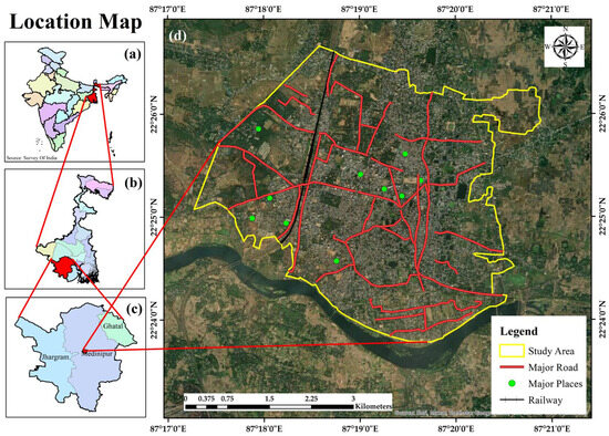 Midnapore is well-connected to both larger cities in the region and smaller towns, villages, and districts. The Midnapore railway station lies on the Howrah route, with several express, local, and passenger trains operating throughout the day between Howrah and Midnapore, as well as Adra and Midnapore. The town also hosts a central bus stand along with several other bus stands situated within the town, facilitating extensive road connectivity. Significant infrastructure developments along the town’s main roads have further enhanced its accessibility and spurred economic growth in the region, contributing to Midnapore’s role as an administrative and commercial center in the Paschim Medinipur district (Figure 2b).