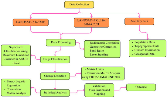 The methodology of this study involved a comprehensive approach to analyse land use and land cover (LULC) changes in Midnapore City over three distinct periods: 2003, 2014, and 2024 (Figure 3). The analysis utilized a moderate-resolution of 30 m satellite imagery from the United States Geological Survey (USGS) Earth Explorer, specifically LANDSAT-5 and LANDSAT-8 OLI datasets for the years 2003, 2014, and 2024. The datasets were complemented with ancillary data such as population statistics, topographical maps, and socio-economic data to provide a contextual understanding of land use and land cover (LULC) changes. In this study, ancillary geospatial data such as proximity to roads, slope, and elevation were used as explanatory variables in the binary logistic regression model to identify the spatial drivers of LULC changes. These layers were derived from topographic datasets and processed using spatial analysis tools in ArcGIS. Although not directly used in the classification process, these variables played a key role in modelling and interpreting land transformation dynamics across Midnapore City.