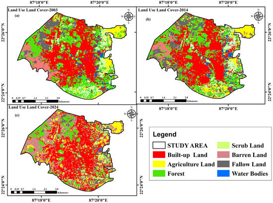 LULC maps for the years (a) 2003, (b) 2014, and (c) 2024.