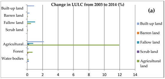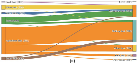 The study conducted on Midnapore city during the period 2003–2014 utilized the Supervised Digital Classification method, specifically the Maximum Likelihood Classifier, to identify the land use and land cover (LULC) classes. A two-way cross-matrix served as the primary analytical tool for determining changes within the study area. To quantify the conversions from one land class to another, cross-tabulation analysis was employed. The analysis of changes among the seven LULC classes from 2003 to 2014 reveals distinct trends in land use transitions, as presented in Table 1 and Figure 5a. The change matrix shows that water bodies transitioned to other classes, including agricultural land (0.18) and built-up areas (0.01), while some remained as water bodies (0.21). Forests saw significant conversions, primarily to agricultural land (0.68), with smaller areas shifting to fallow land (0.01) and built-up land (0.18). Agricultural land largely persisted (11.93) but also transitioned to scrub land (0.24), fallow land (0.78), and built-up areas (0.18).