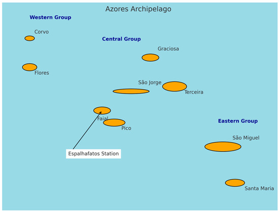 According to Meirelles et al. [31], the prevailing atmospheric conditions in the Azores are primarily influenced by the position and intensity of the Azores High, the dynamics of the depressions along the Polar Front, and the moderating effect of the ocean—particularly due to the influence of the warm Gulf Stream. Carvalho et al. [32] further emphasize that the archipelago’s proximity to the North Atlantic Subtropical Anticyclone (commonly known as the Azores High) has established the region as a key reference point for the characterization of atmospheric circulation patterns that influence weather in Western Europe.