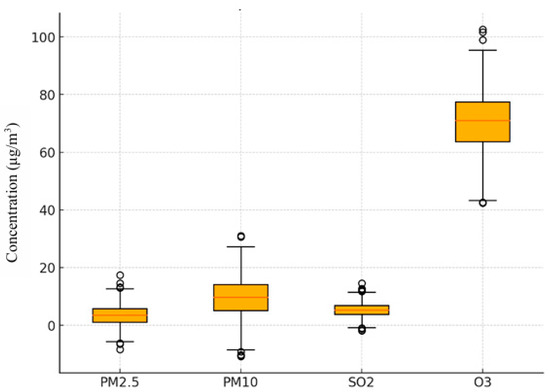 To analyze the dispersion of PM2.5, PM10, SO2, and O3, the Python (v3.10.0) software (Matplotlib) was used to create boxplot graphs as shown in Figure 3.