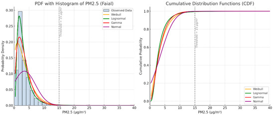 The selection of the Lognormal, Gamma, Weibull, and Normal distributions was based on their historical and theoretical suitability for modeling air pollutant concentrations, particularly those characterized by right-skewed behavior and high variability. The Lognormal distribution is widely used in air quality studies for PM2.5 due to its ability to model non-negative, positively skewed data arising from multiple small-scale sources and occasional high-emission events. The Gamma distribution is often employed for PM10, especially in regions affected by episodic dust intrusions, as it captures heavy-tailed behavior well. Weibull distribution is commonly applied in environmental statistics due to its flexibility in modeling skewed data, and the Normal distribution was included for comparative purposes, despite its limitations with skewed datasets. These choices are well supported in the literature by Zhang et al. [35] and Noor et al. [36] and were validated in this study through Kolmogorov–Smirnov tests, AIC, and BIC criteria.